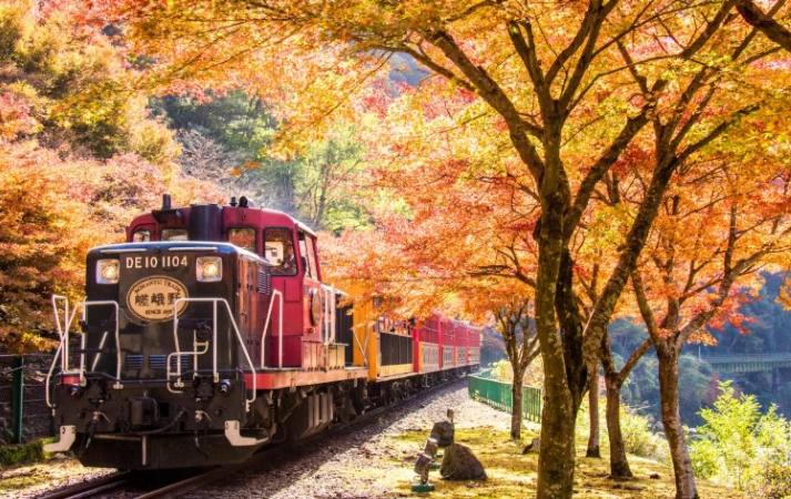 嵯峨野トロッコ列車は、京都・嵐山の紅葉シーズンに大人気の観光列車。