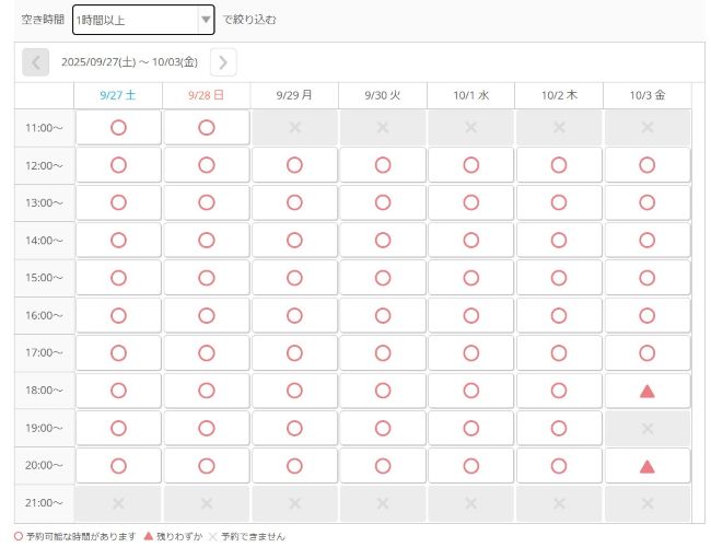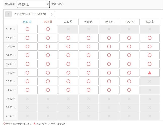 空き時間を選ぶと、カレンダーで予約できるかどうか〇・△・×で表示されます。
